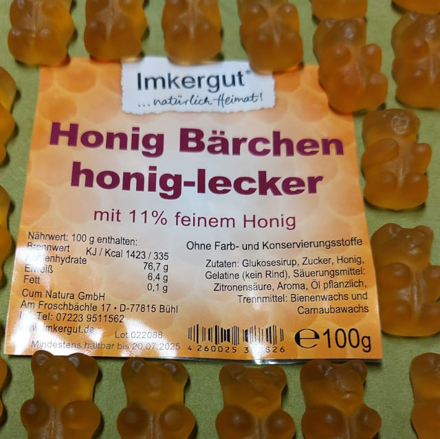 Glukosesirup, Zucker, Honig, Gelatine ( kein Rind), Säuerungsmittel: Zitronensäure, Aroma, Öl pflanzlich, Trennmittel: Bienenwachs und Carnaubawachs