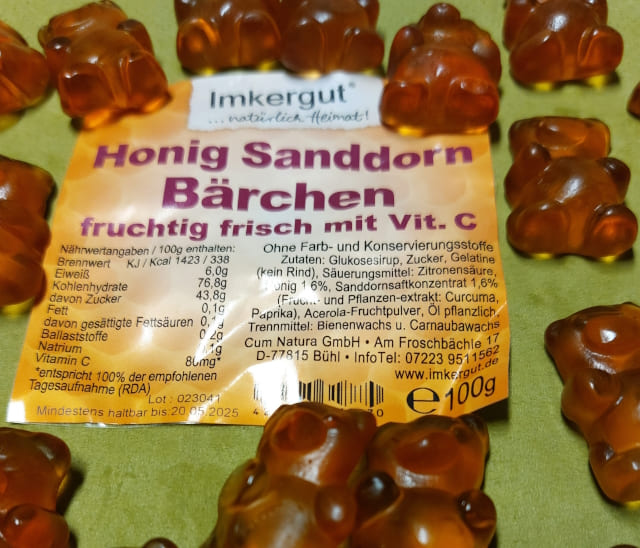 Glukosesirup, Zucker, Gelatine ( kein Rind), Säuerungsmittel: Zitronensäure, Honig 1,6 %, Sanddornkonzentrat 1,6 % ( Frucht- und Pflanzenextrakt: Curcuma, Paprika), Acerola Fruchtpulver, Öl pflanzlich, Trennmittel: Bienenwachs und Carnaubawachs